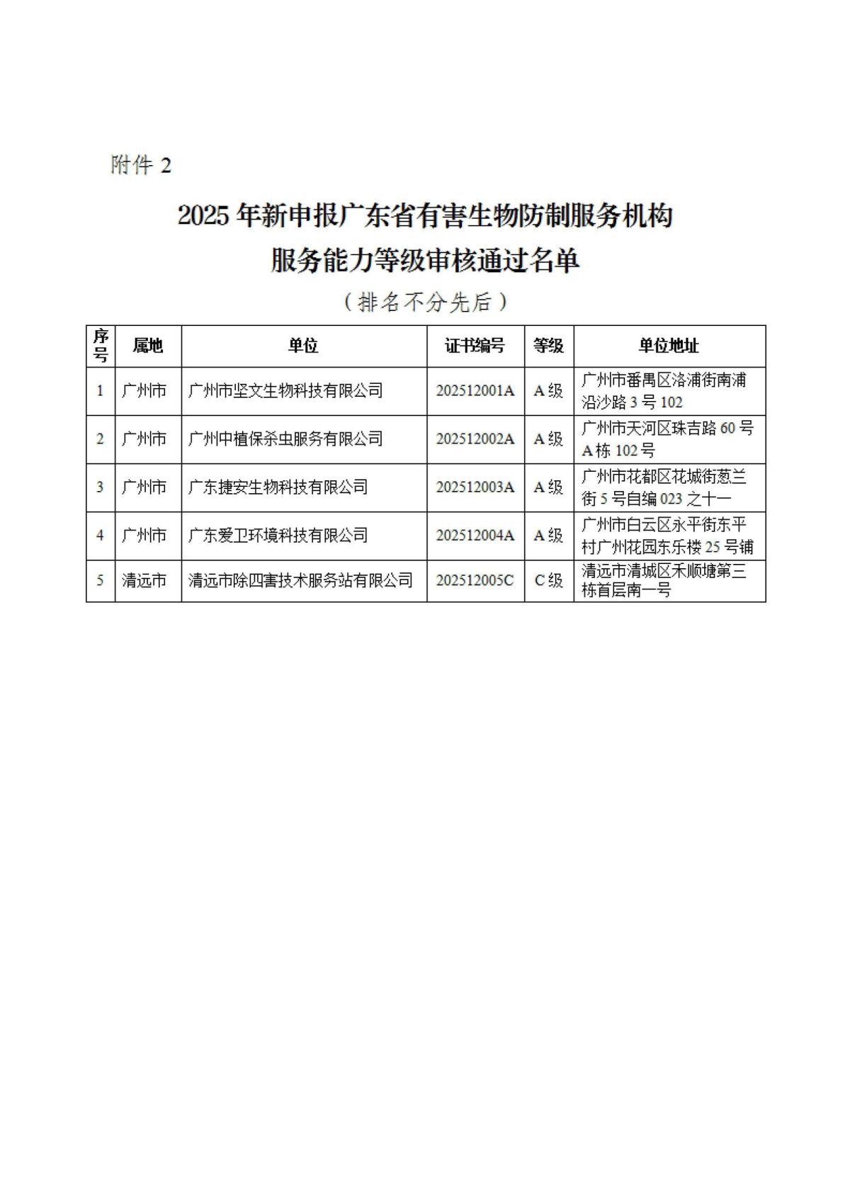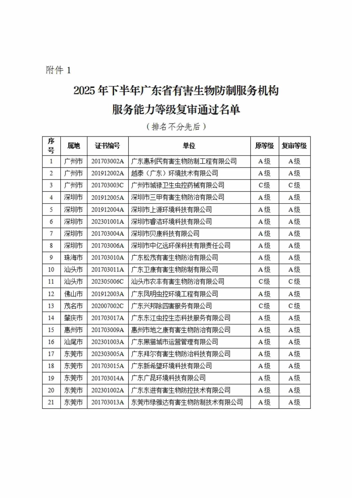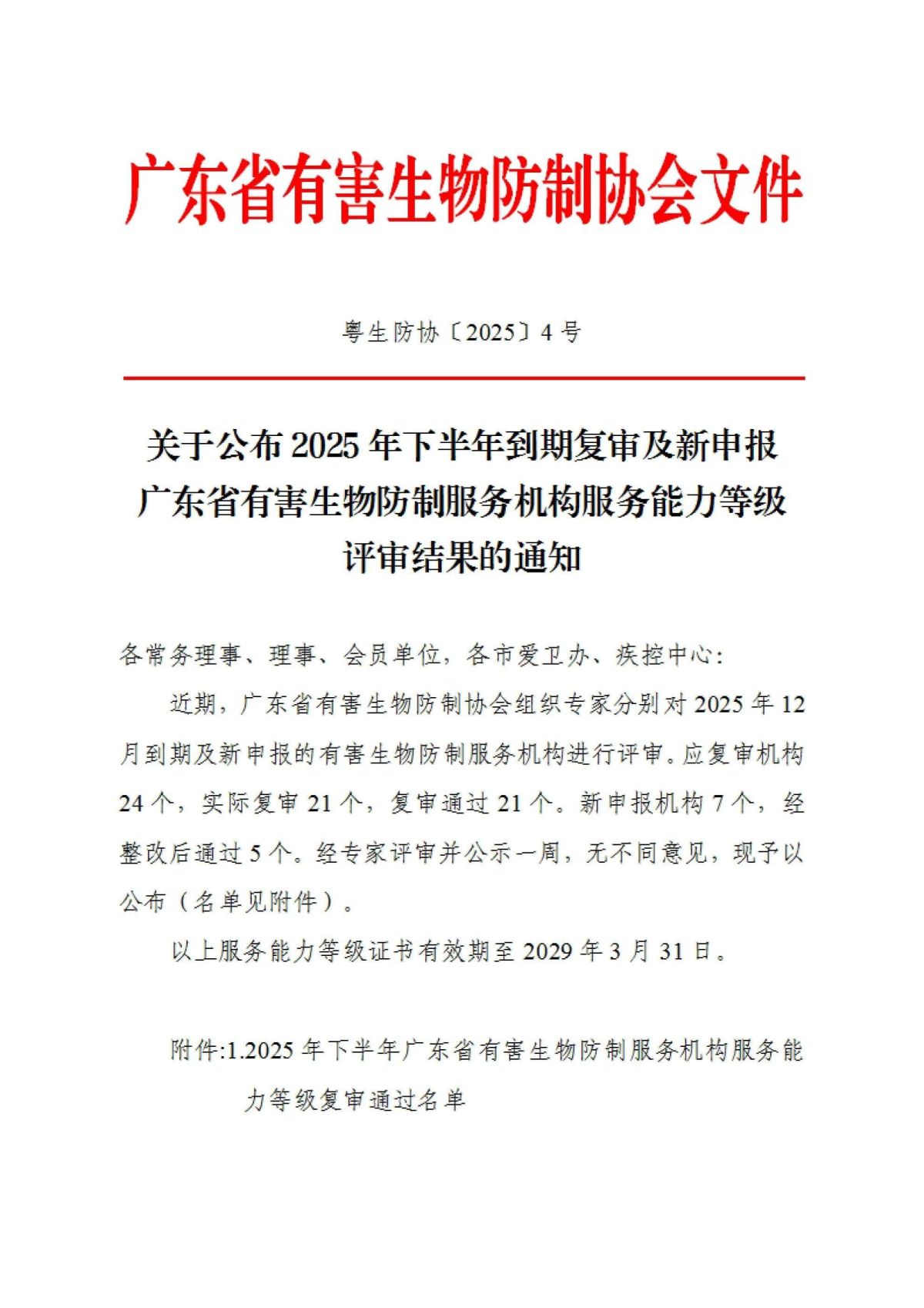 【评定】关于2025年12月服务能力等级到期复审及新申报广东省有害生物防制服务机构评审通过的通知